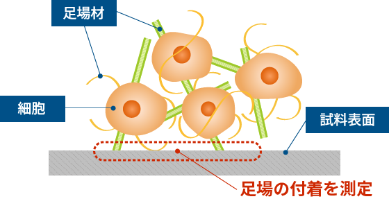 細胞が材料表面にどの程度接着しているか、あるいは剥離しているかを染色による反応で評価します。