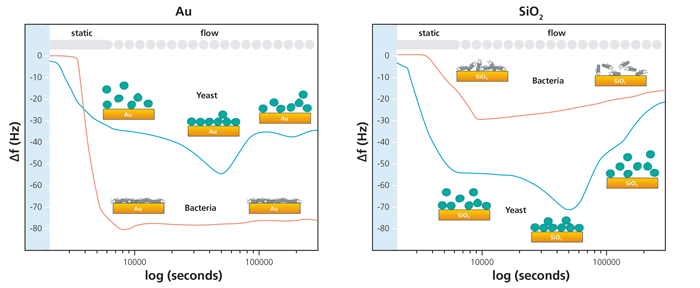 表面自由エネルギーの異なる金と二酸化ケイ素表面への、モデル真核細胞(S. cerevisiae:酵母)とモデル原核細胞(E. coli:大腸菌)の吸着速度論をQCM-D法で研究しました。